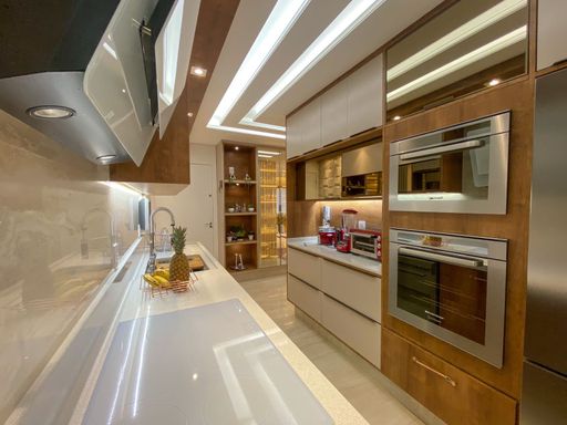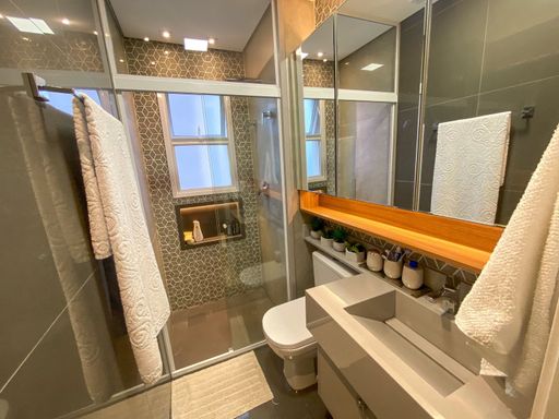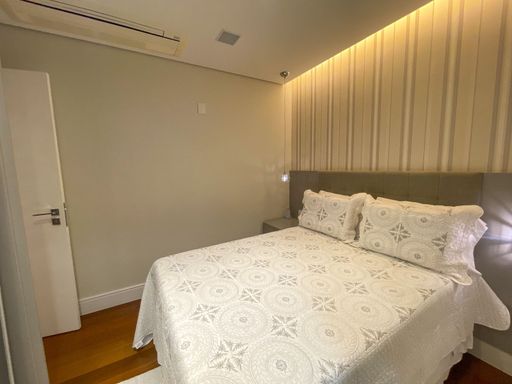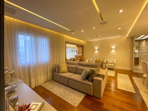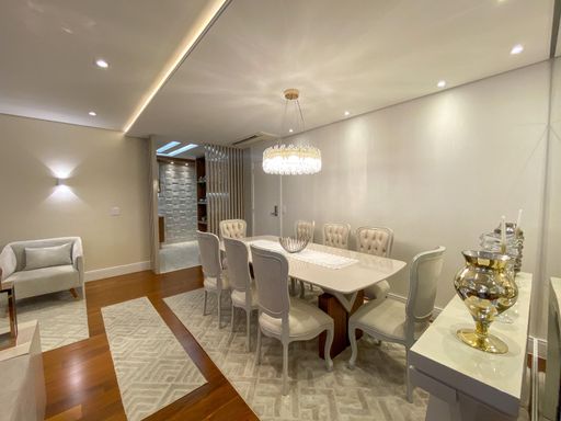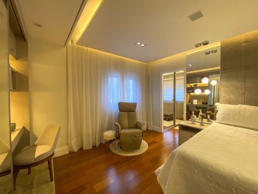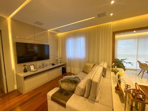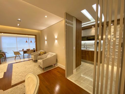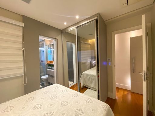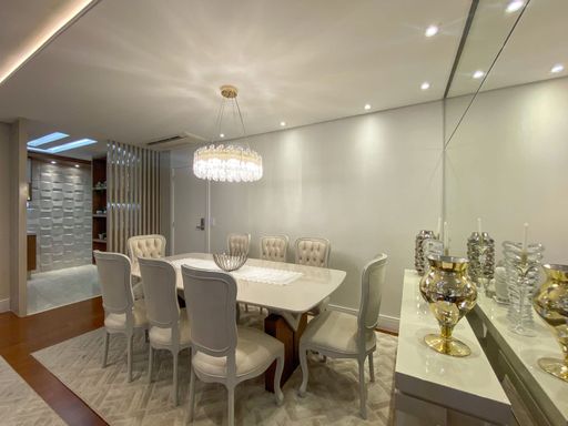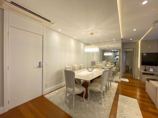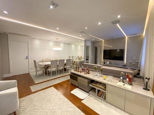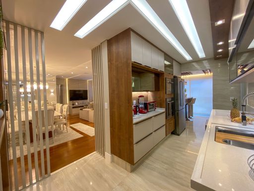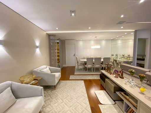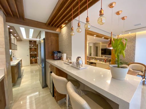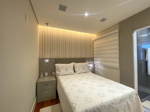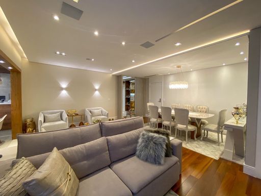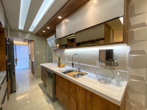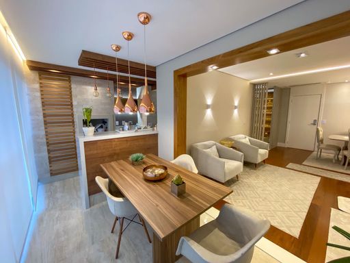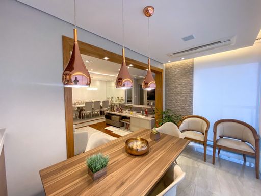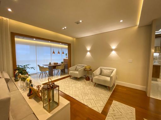 124 m2, 2 suítes, closet, living ampliado, espaço social integrado sendo sala de estar, jantar, varanda gourmet, cozinha, móveis planejados, ar condicionado, eletrodomésticos, fechamento de vidro na varanda, persianas, 2 vagas de garagem cobertas, condomínio com lazer completo.
